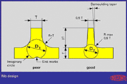 對于表面要求非常高的組件,如汽車輪蓋,的尺寸是非常重要的。正確的設(shè)計可以減少組件形成表面凹痕的可能,以提高組件的質(zhì)量。的底部的材料積聚在圖1所示的圓中。這個圓的大小與的尺寸相關(guān),應(yīng)該越小越好,這樣才能減小或避免凹痕。如果圓太大,可能會形成內(nèi)部空洞,制品的機(jī)械性能將會非常差。