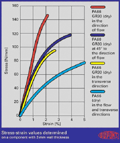 在注射成型過程中,長鏈的塑料分子、纖維填料和增強材料的取向主要由熔融塑料的流動方向決定,這導致了部件性能對方向的相關性(各向異性)。例如,流動方向上的伸展性能比垂直方向上的伸展性能要好得多(見圖1)。含有纖維增強材料的部件所受到的影響比不含纖維增強材料的部件要大得多。纖維的取向也引起部件在水平和垂直方向上的收縮差異,這將異致部件發(fā)生翹曲。