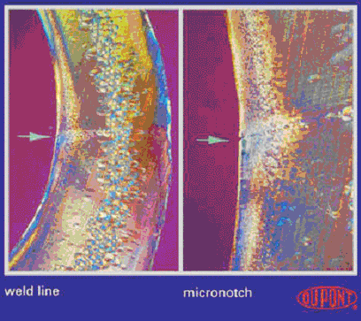 當模具中2條或更多的熔流會聚到一起時,就會產(chǎn)生熔合線。例如,在熔體需要流經(jīng)嵌件,或制品同時在幾點進行澆注時,就會出現(xiàn)熔合線(見圖2a和2b)。而且,同一制品中不同的壁厚可能導致熔體前方分離,從而產(chǎn)生熔合線。當應從模具中排除的空氣被熔體封閉在模具中無法溢出時,就會產(chǎn)生空氣存集(出現(xiàn)氣泡)。熔合線和空氣存集通常被作為表面缺陷的表現(xiàn)。除了會使表面難看外,它們還會明顯降低受影響區(qū)域的機械性能,特別是沖擊強度(見圖3和圖4)。
