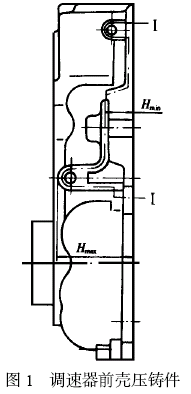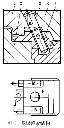圖1 是汽車油泵調(diào)速器前殼壓鑄件示意圖, Ⅰ- Ⅰ分型面需用抽芯才能完成脫模,其最低抽芯高度Hmin 為17mm, 最大抽芯高度Hmax為45mm, 為了保證滑塊有足夠的退位空間而不發(fā)生自鎖, 滑塊的高度必須大于或等于45mm。為避免抽芯距離過大造成滑塊體積增加, 在設(shè)計(jì)中采用了局部增高多級(jí)鎖緊結(jié)構(gòu),如圖2 所示。P 是高于17mm低于45mm的面,N是高于45mm的面,M面是與N面同高且保證N 面受力平衡的輔助結(jié)構(gòu)。α為抽芯角,β1 、β2 為鎖緊角,β1 、β2 不僅具有鎖緊作用,而且在開模抽芯時(shí)還具有讓位的作用,所以β1 、β2 必須大于α, 而且β2 應(yīng)大于β1 , 否則開模時(shí), 滑塊會(huì)出現(xiàn)自鎖。鎖緊角β2 也可以等于β1 , 但由于制造時(shí)有誤差, 如果誤差大, 則β1和β2 形成的鎖緊面會(huì)出現(xiàn)干涉。在壓鑄件調(diào)速器前殼模具設(shè)計(jì)中, α取23°, β1 取26°, β2取30°,實(shí)現(xiàn)了安全生產(chǎn)。