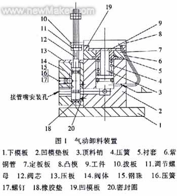 隨著壓力機滑塊上行,一方面壓縮空氣推動頂料銷3克服彈簧4的壓力,使工件9與凹模板19和這位板7脫離,完成卸料功能;另一方面,壓縮空氣通過紫銅管成一定角度吹出,一是使工件9與凸模分離,二是將工件9吹出模具表面,完成了卸料及出件,見圖2。